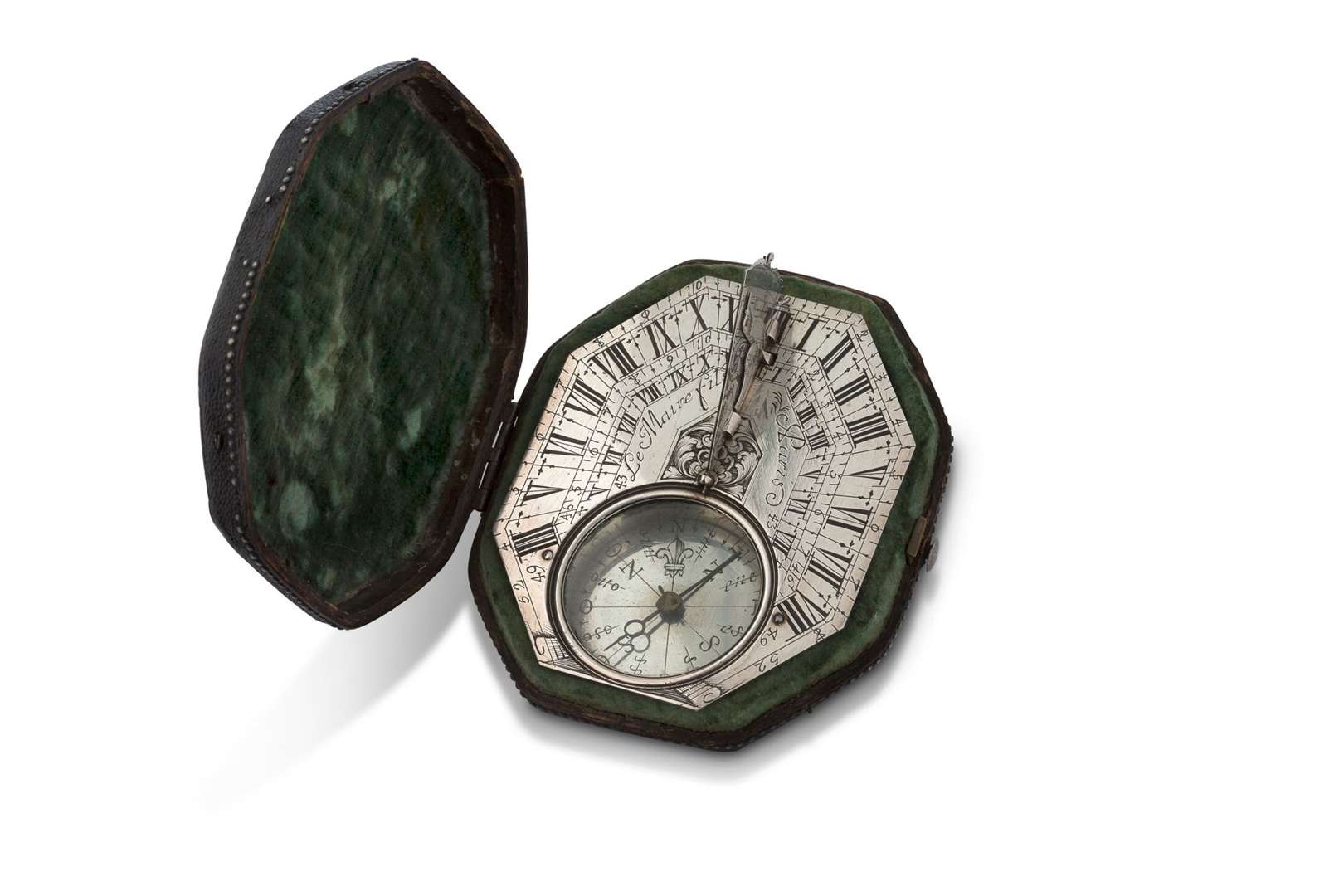 Cadran solaire portatif horizontal en argent de type Butterfield, la platine octogonale à quatre divisions horaires gravée de rinceaux en son centre et signée «Le Maire Fils à Paris» gnomon à l'oiseau, le dos gravé des latitudes de villes européennes, la boussole à seize directions, le nord indiqué par une fleur de Lys.