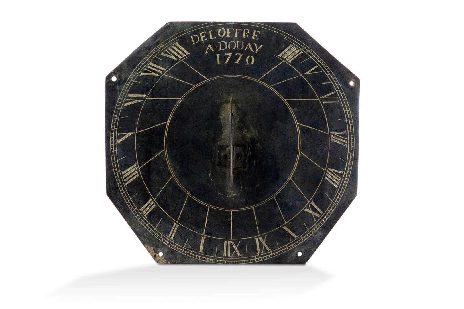 Cadran solaire octogonal horizontal en laiton gravé, signé «Deloffre à Douay 1770».