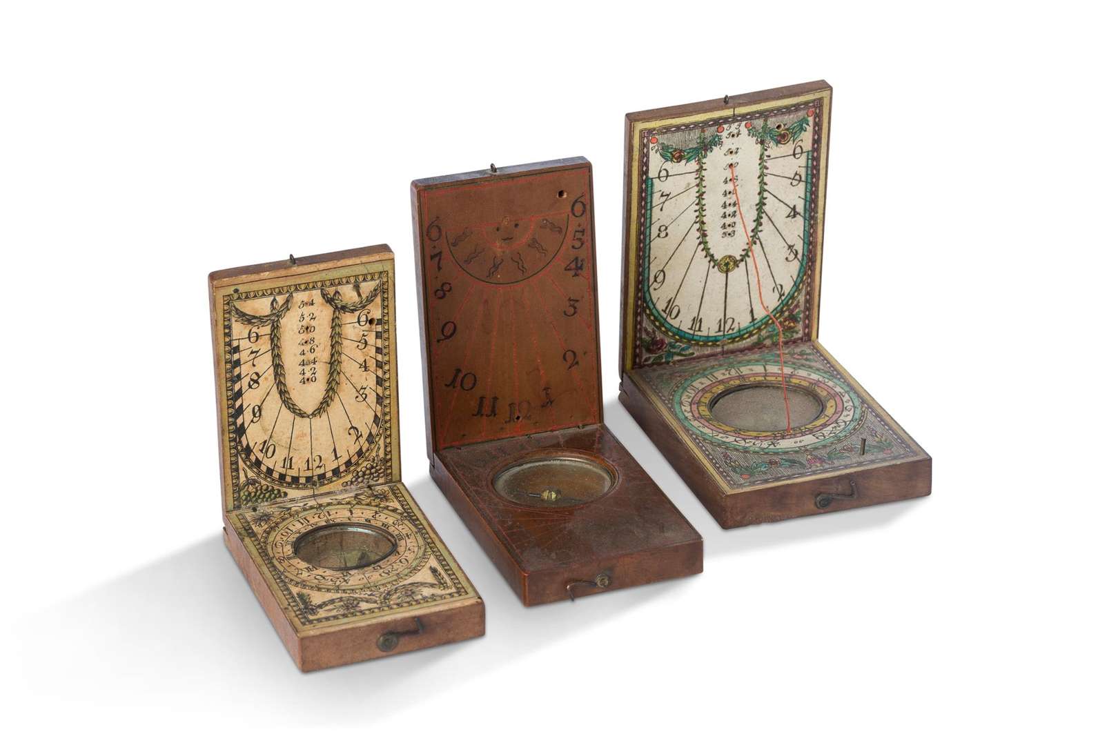 Ensemble de trois cadrans solaires diptyques en bois et papier imprimé coloré.