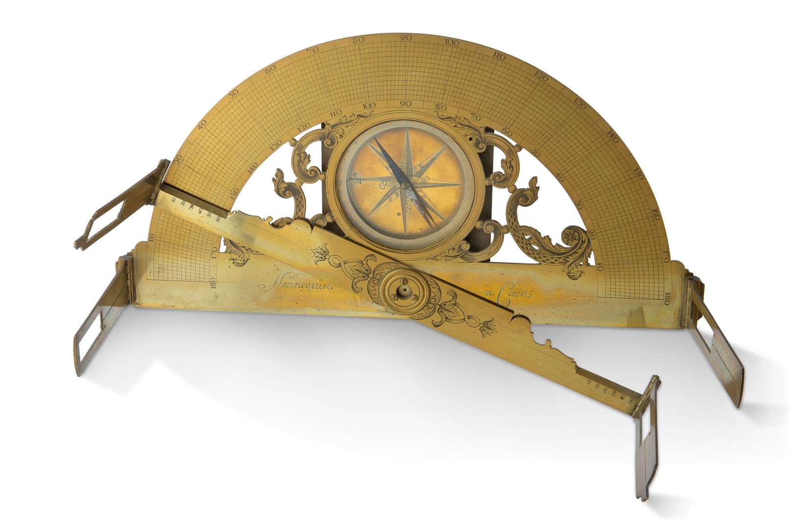 Important graphomètre en laiton doré à quatre pinnules rabattables, la platine ajourée gravée de rinceaux, centrée d'une boussole à huit directions et signé «Hennequin a Caën».
