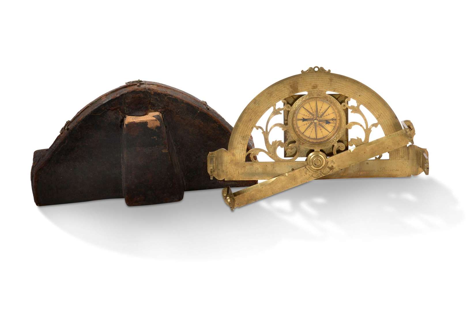 Graphomètre à pinnules en laiton, la platine ajourée gravée de rinceaux centrée d'une boussole, signée et datée «Cadot,