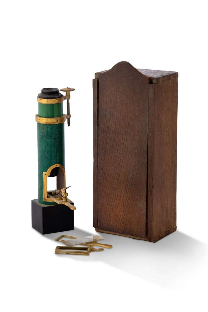 Microscope composé laiton, galuchat teinté vert et bois, avec molette régl