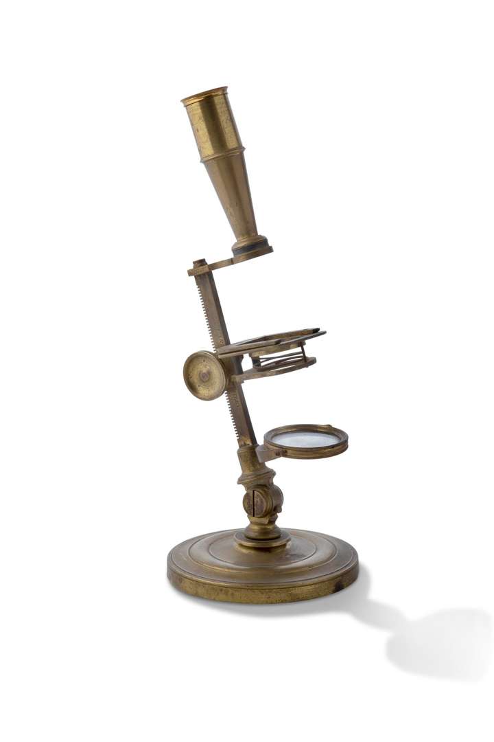 Microscope composé en laiton sur socle circulaire, système à crémaillère signé «Carpenter & Westley / 24 Regent