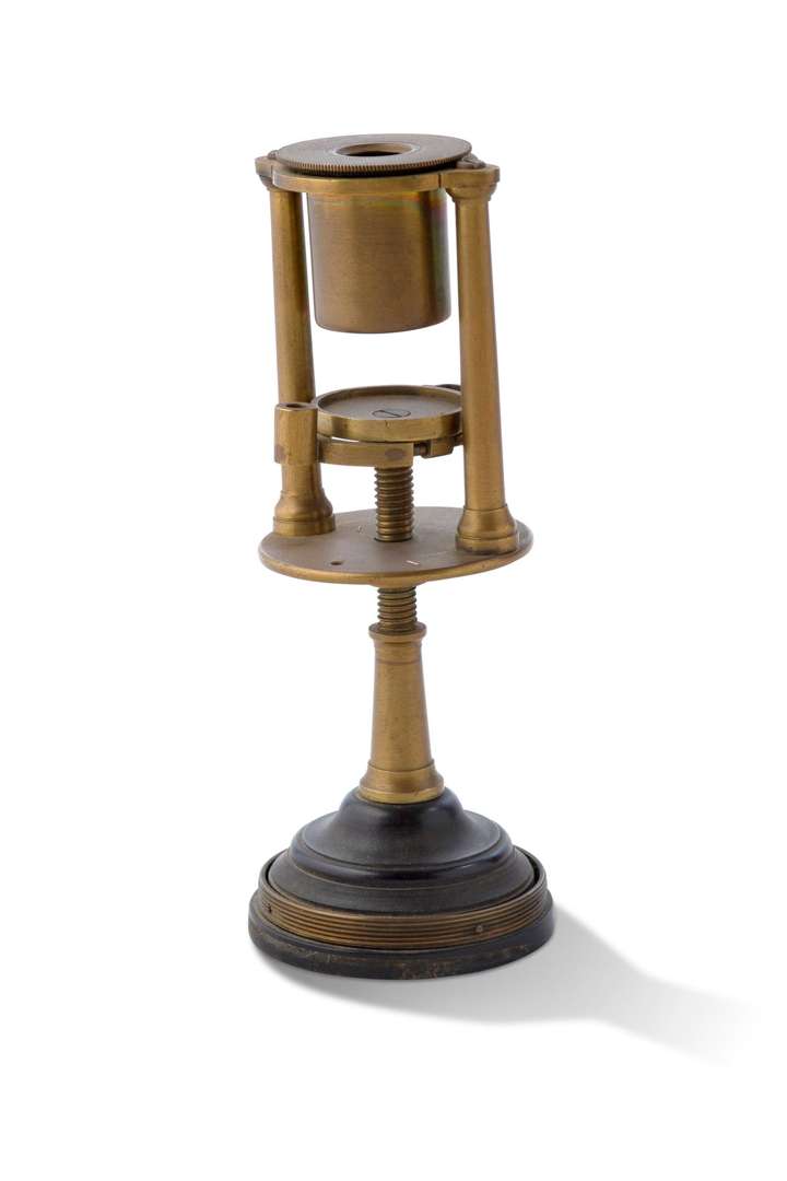 Microscope simple d'entomologiste en laiton sur pied circulaire en bois tourné.