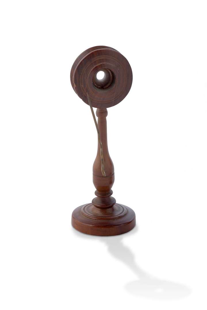 Microscope simple en bois tourné sur piédouche balustre, avec pique porte-objet en laiton, portant une étiquette sous la base «Jourdain au Mans», dans son étui cylindrique d'origine portant l'étiquette du constructeur.