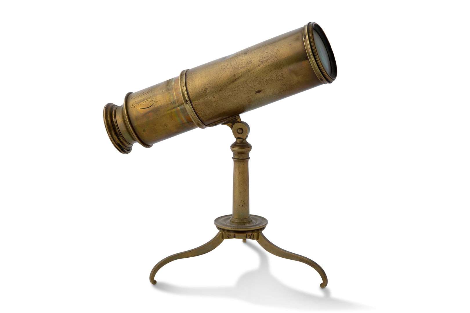 Téléscope à lentilles en laiton à un tirage, reposant sur un piètement tripode à pieds rabattables. signé «Dollond