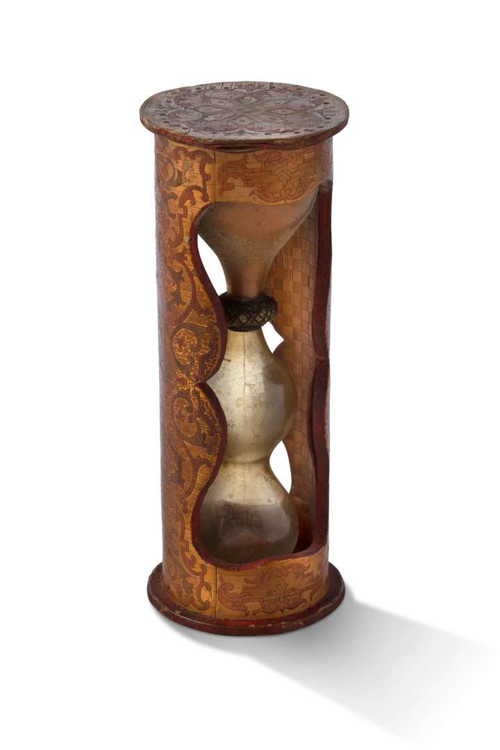 Sablier à ampoules en verre soufflé, triple bulbes, sable orangé, anneau de jonction recouvert de cordelette, la monture à âme en bois et marqueterie de paille à riche décor polychrome de rinceaux feuillagés et rosaces aux extrêmités.