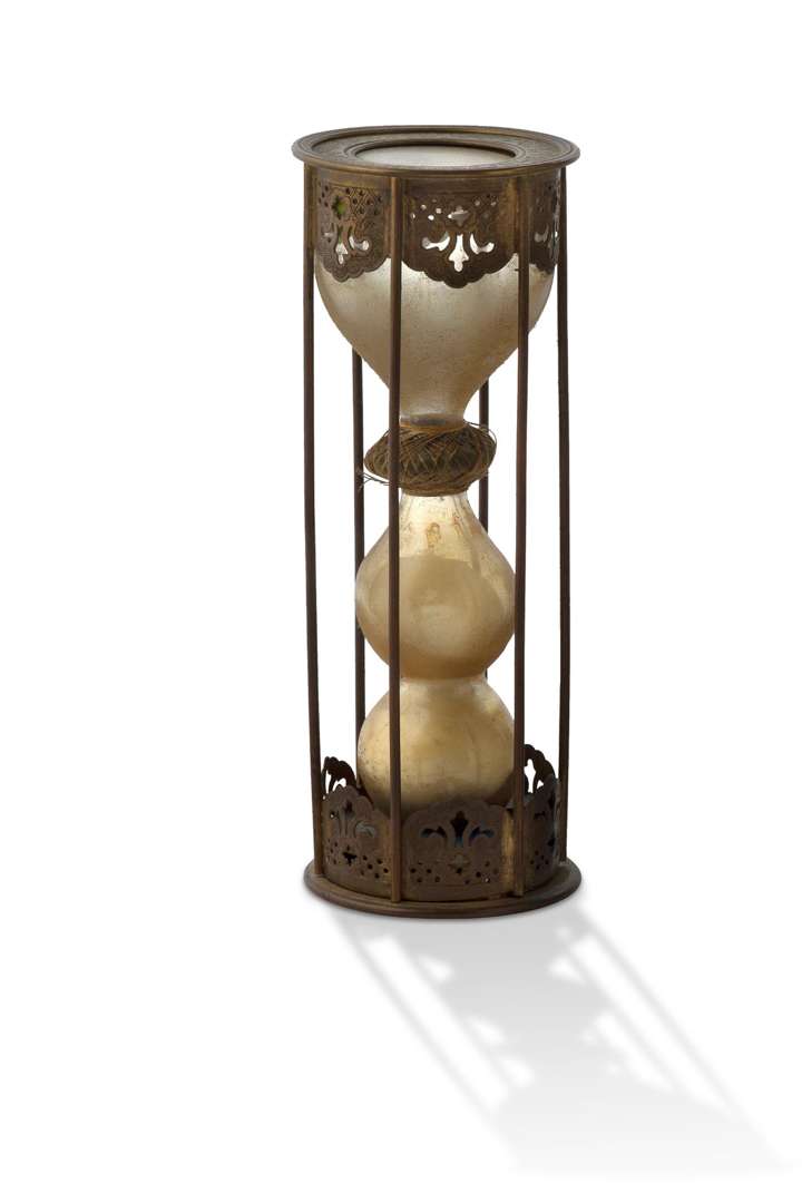 Sablier à ampoules en verre soufflé, triple bulbes, sable blanc, anneau de jonction recouvert de cordelette, la monture circulaire en laiton à six colonnettes gravée d'une frise fleurie et ajourée de rinceaux.