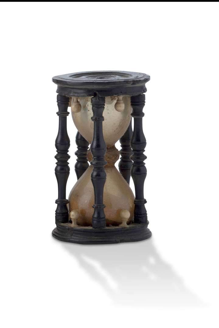 Sablier de marine à ampoules en verre soufflé, sable orangé, anneau de jonction recouvert de cordelette, la monture circulaire en ébène à six colonnettes balustres tournées alternées de billes en os.