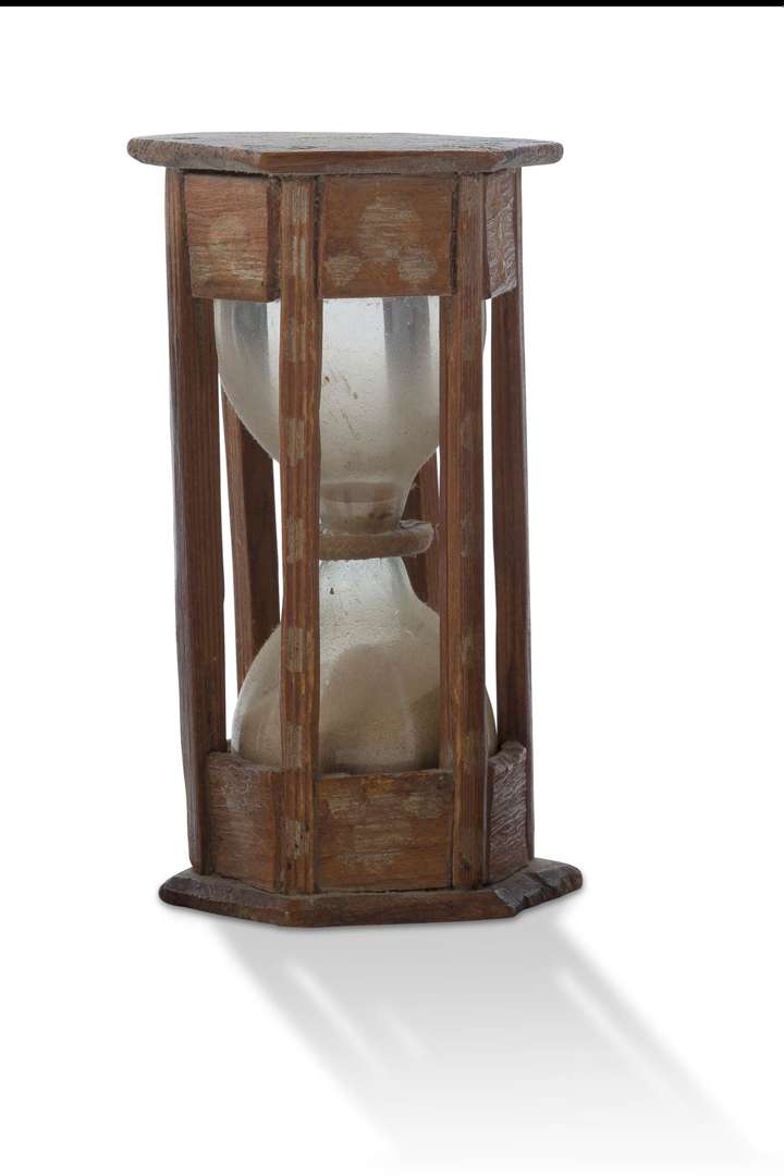 Sablier à deux ampoules en verre soufflé, sable orangé, anneau de jonction cartonné, la monture hexagonale en bois peint à six colonnettes.