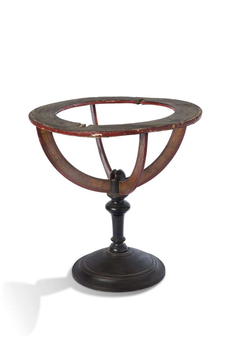 Support de globe en papier maché, le pied balustre en bois noirci tourné.