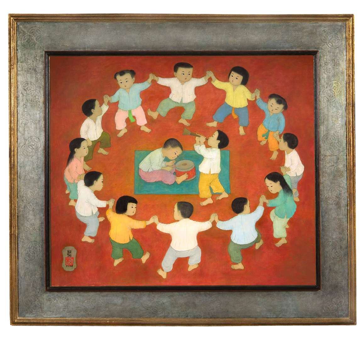 Mai Trung Thứ a toujours été très engagé pour la paix et l’indépendance du Vietnam, c’est dans cette logique qu’il collabore avec l’Unicef et peint de nombreuses scènes de jeux d’enfants afin de sensibiliser le public occidental et de récolter des fonds jusqu’en 1965. Cela lui confère une grande notoriété et lui permet de rendre public ses combats politiques et sociaux. Cette oeuvre de Mai Trung Thứ s’inscrit parfaitement dans ce contexte. Il représente des enfants jouant dans une atmosphère colorée et joyeuse, comme figés hors du temps. L’innocence de ces personnages et leur joie de vivre sont parfaitement représentées par le talent du peintre sur soie grâce à un trait assuré et à l’utilisation d’une palette vive et chatoyante. Deux des sujets de prédilection de Mai Trung Thứ sont présents, les enfants et la musique, qui donnent de la vitalité au tableau et le rattachent à ses racines vietnamiennes.