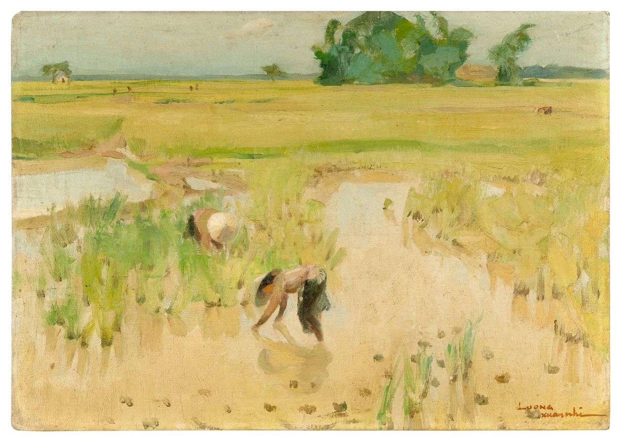 Lương Xuân Nhị joue avec la lumière et les couleurs. Le ciel lumineux d’une fin de journée se reflète sur les parterres minéraux de la rizière. Au second plan, nous retrouvons les silhouettes des travailleurs, créant une unité avec le paysage. L’artiste parvient à rendre une atmosphère douce et paisible, caractéristique de son style pictural.