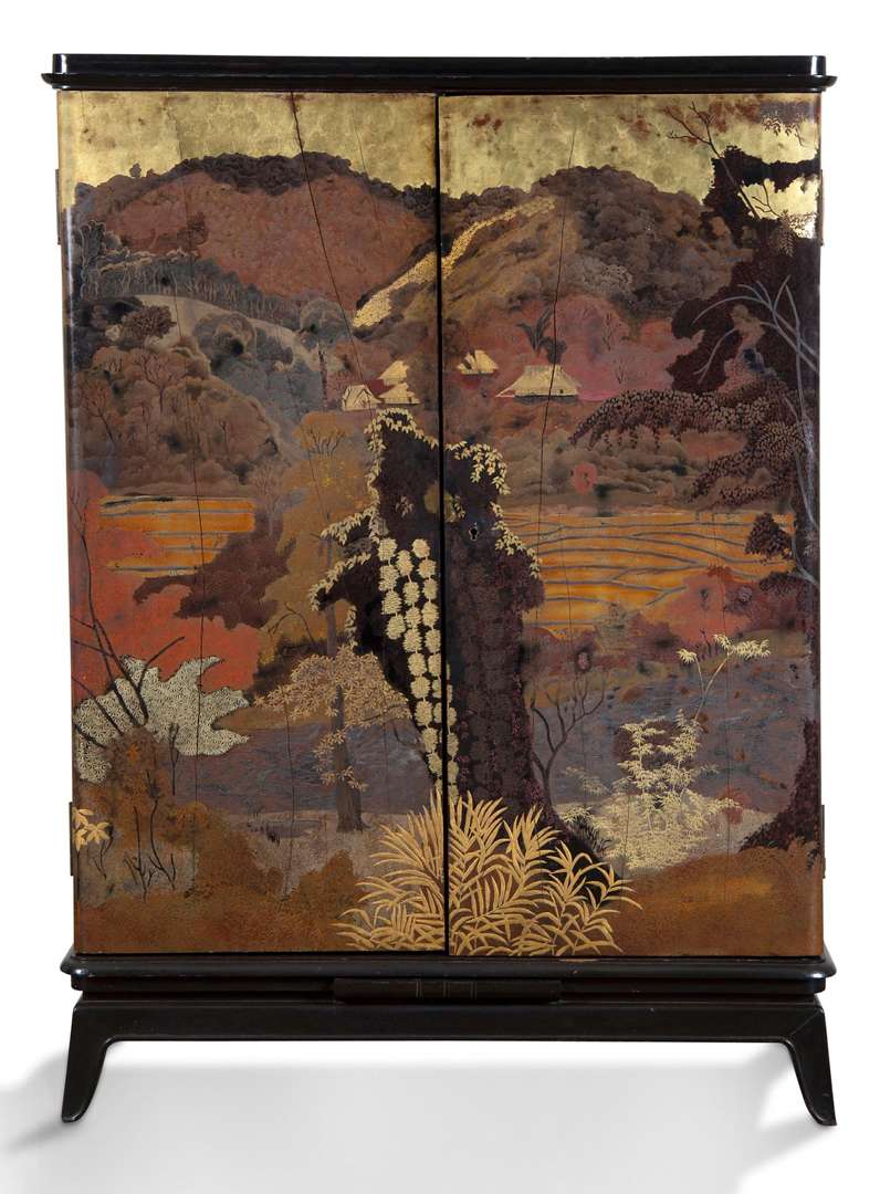 Armoire en bois laqué polychrome et rehauts d'or et d'argent, ouvrant à deux portes découvrant deux compartiments et huit tiroirs, la façade et les côtés décorés d'un ruisseau aux rives bocagères, des champs, des rizières, et en arrière-plan des chaumières encadrées de montagnes.