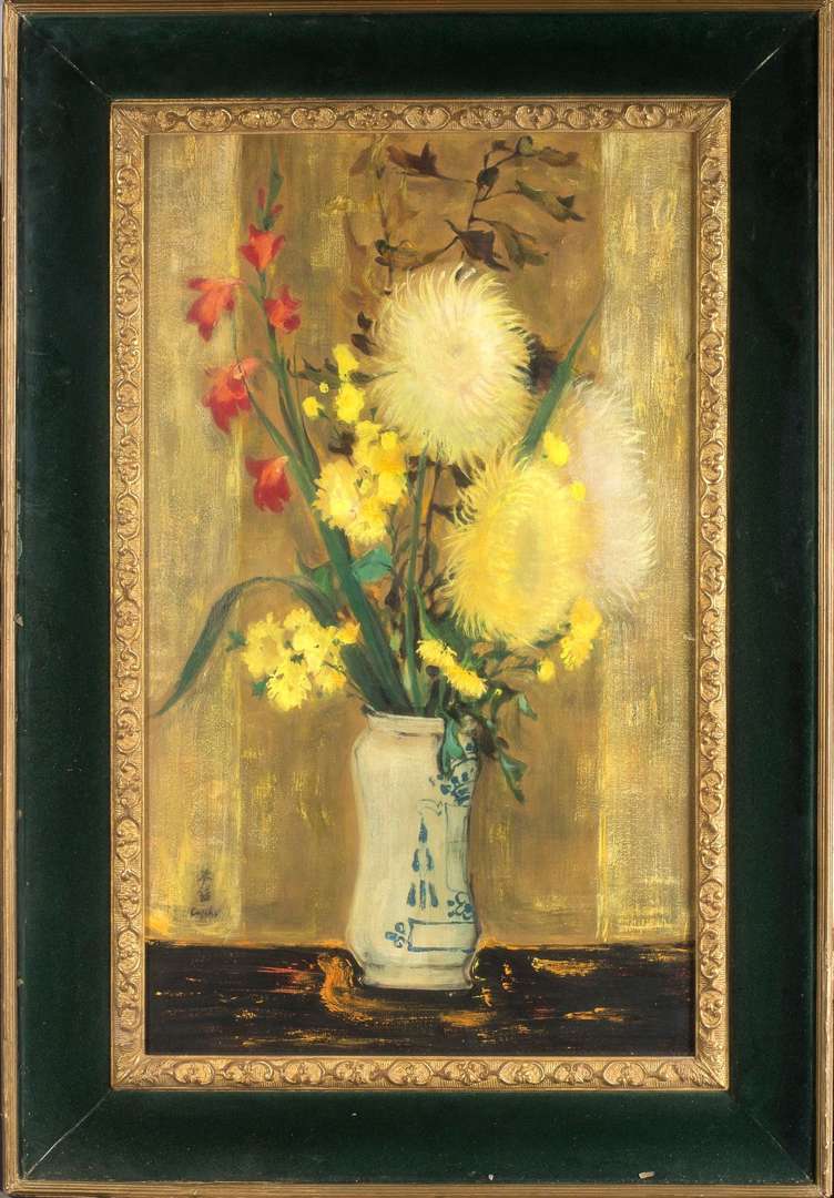 Si les natures mortes sont récurrentes dans l’oeuvre de Lê Phổ, le choix d’un vase typiquement européen est plus inhabituel et contraste délicatement avec l’emploi de la soie, caractéristique de la culture asiatique. La composition florale aux notes automnales voir hivernales faite de chrysanthèmes, jasmins d’hiver, Crocosmia Lucifer et fleurs séchées apporte une palette joyeuse dans les tonalités jaune et rouge. Le choix des chrysanthèmes n’est pas anodin et rappelle les origines asiatiques de l’artiste. Évoquant le calme, la noblesse d’esprit ou encore la longévité, ces fleurs ont une symbolique particulière. Leurs pétales jaunes, rappellent la puissance et la royauté. Couleur de l’or, ils soulignent le pouvoir et la prospérité. En mêlant les différentes influences asiatiques et européennes, Lê Phổ renouvelle le genre classique de la nature morte, apportant une vision multiculturelle alliée à une douceur remarquable.