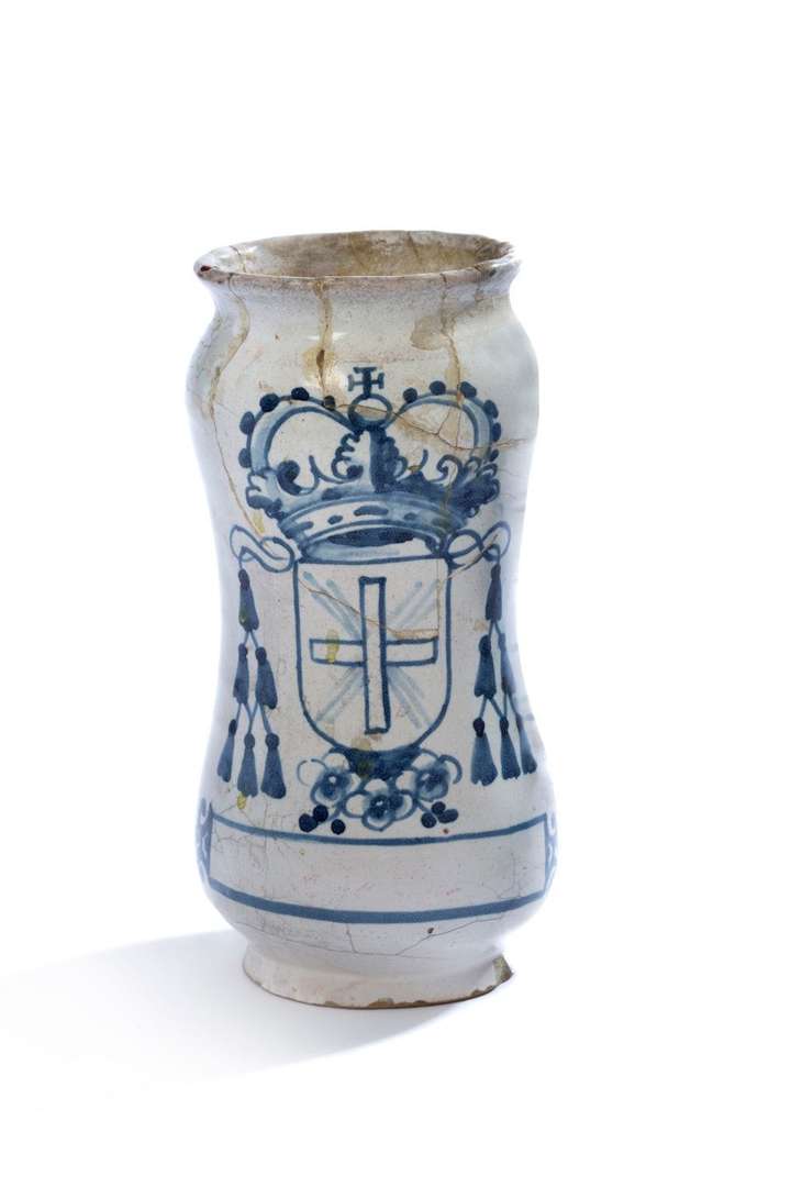 ALBARELLO OU POT À PHARMACIE en faïence blanche et décor peint en camaïeux bleu d'armoiries épiscopales surmontant un cartouche vierge pour inscrire le nom de l'essence contenue.