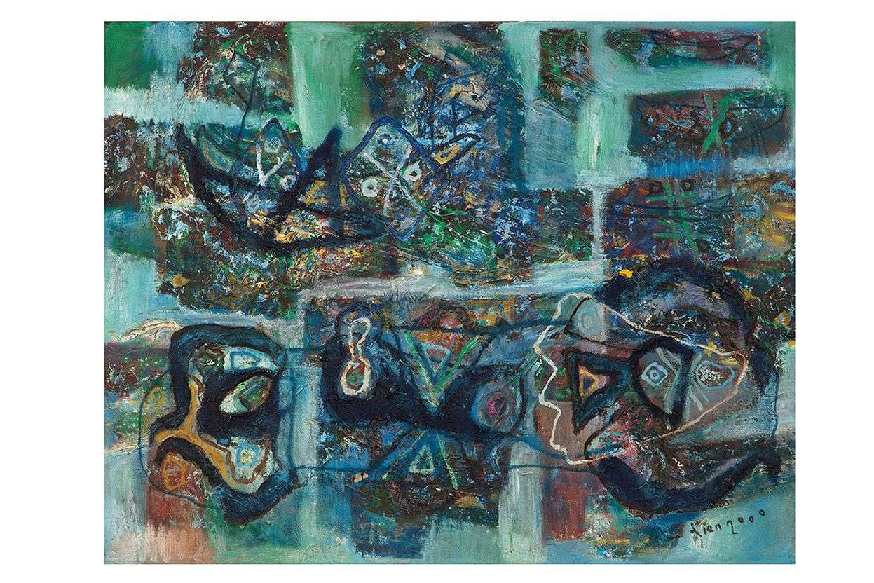 Toile d'origine. Toile détendue. Enfoncement. On note des manques de matière épars ainsi qu'une épaisseur de salissures. L'examen à la lumière fluorescente ne montre aucun repeint. Etiquette au dos "Vuon Phu Sa / hoasi : Lê Triêu Dien / chat lieu : son dâu / 70 x 90 / Già