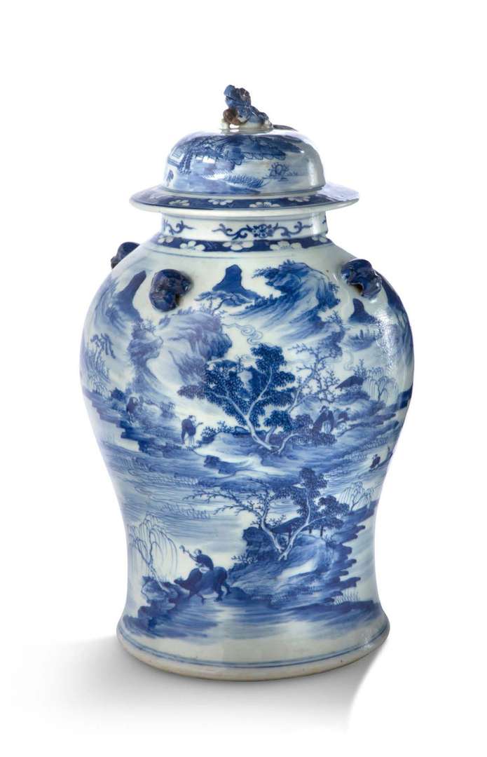 Importante potiche couverte en porcelaine bleu-blanc décorée d'un paysage lacustre peuplé de lettrés, bouvier et pêcheur. L'épaule avec quatre têtes de lions bouddhiques appliquées. La prise du couvercle en forme de lion bouddhique. La base glaçurée avec les lettres «NTL» et «L» incisées à l'aiguille.