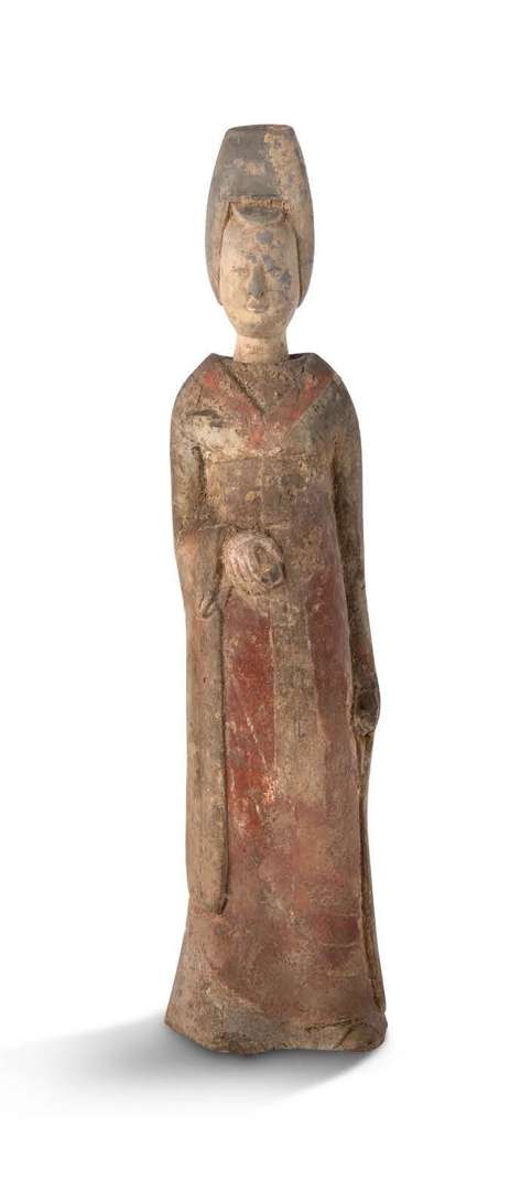 Mingqi en terre cuite figurant une dame de cour debout, vêtue d'une robe à longues manches ceinturée sous la poitrine.