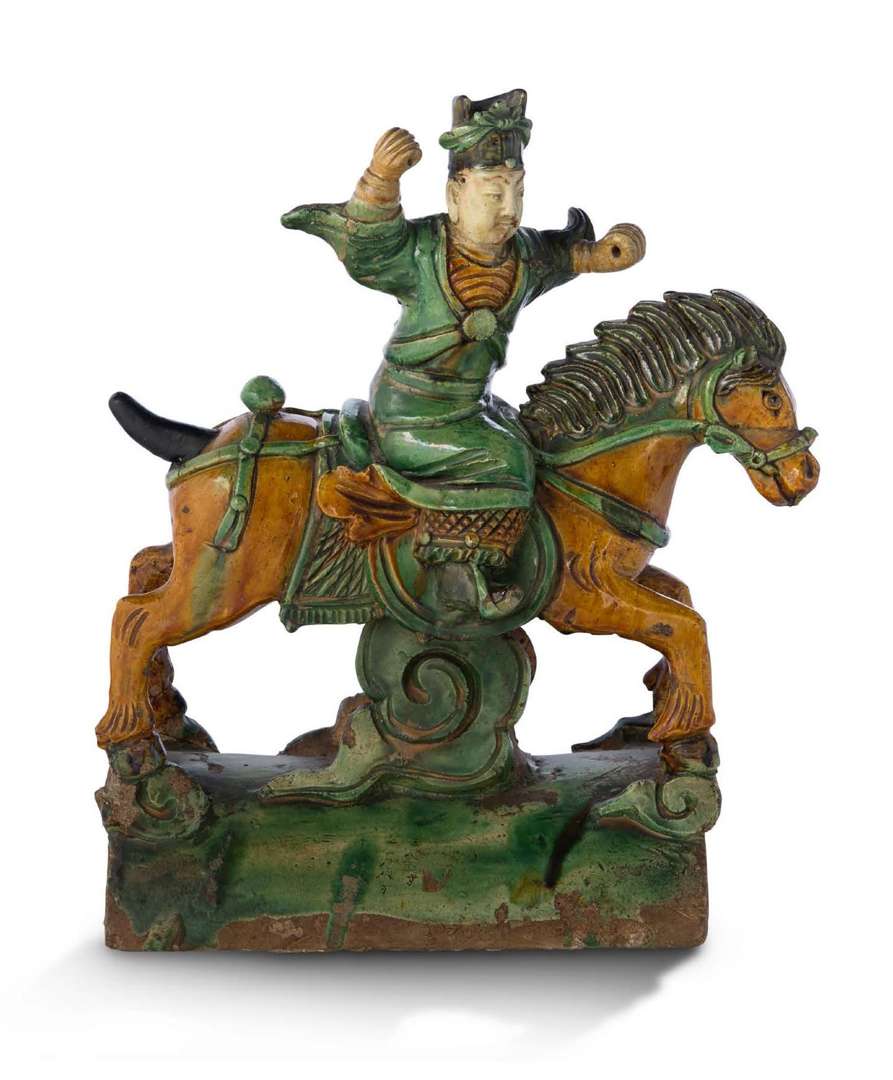 Tuile faîtière en terre cuite émaillée sancai figurant un cavalier sur son cheval, galopant sur des nuages spiralés.