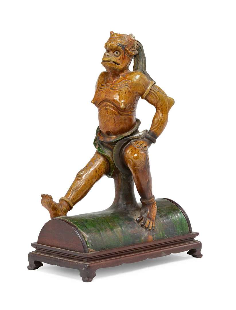 Tuile faîtière en grès à couverte sancai figurant un démon assis, une jambe tendue devant lui.