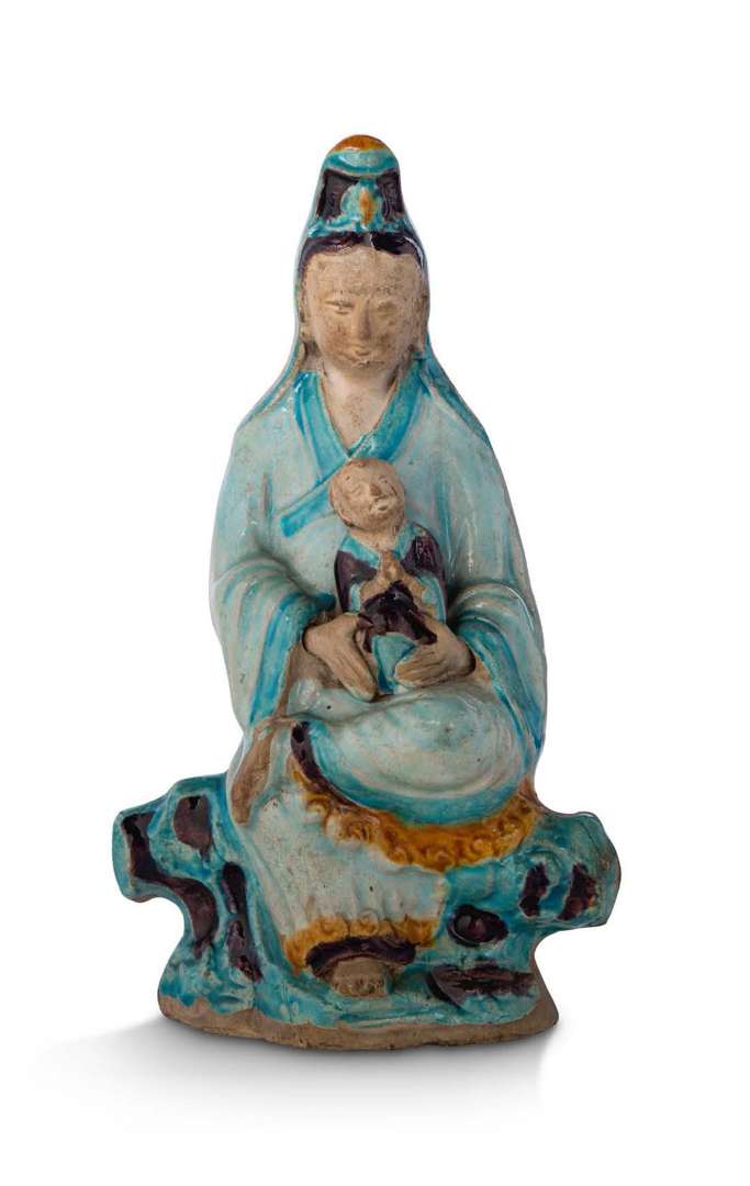 Figure en grès à couverte Fahua représentant Songzi Guanyin, assise en délassement royal sur un rocher, portant un enfant sur ses genoux. Le visage, les mains et les pieds laissés nus.