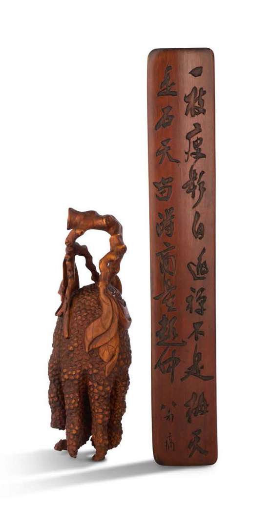 Ensemble comprenant un repose-poignet en bambou teinté à décor gravé calligraphié et une petite sculpture en bois naturel figurant un citron digité avec sa tige et quelques feuilles.