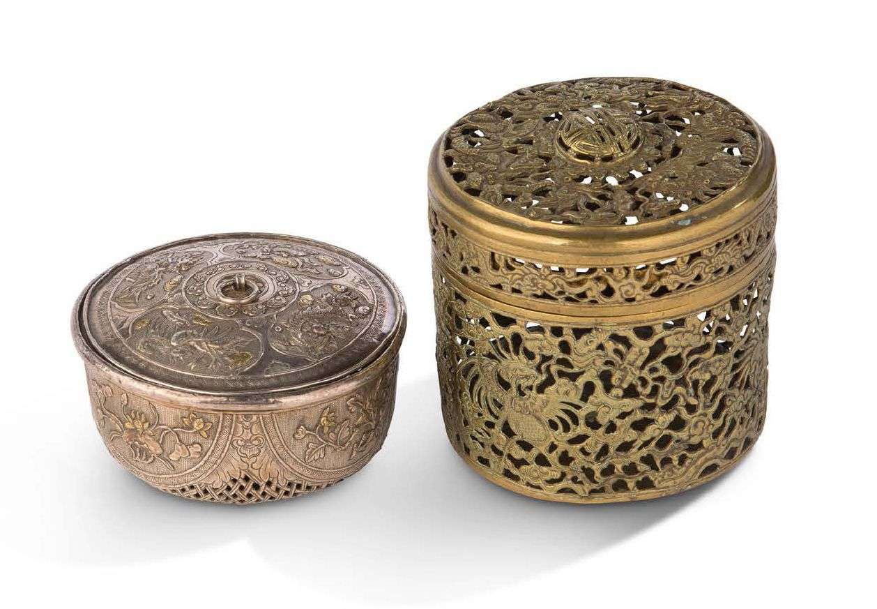 Boîte ronde couverte en bronze ajouré décoré des quatre animaux sacrés (Tu Linh). La base avec une marque apocryphe Jiajing gravée postérieurement.