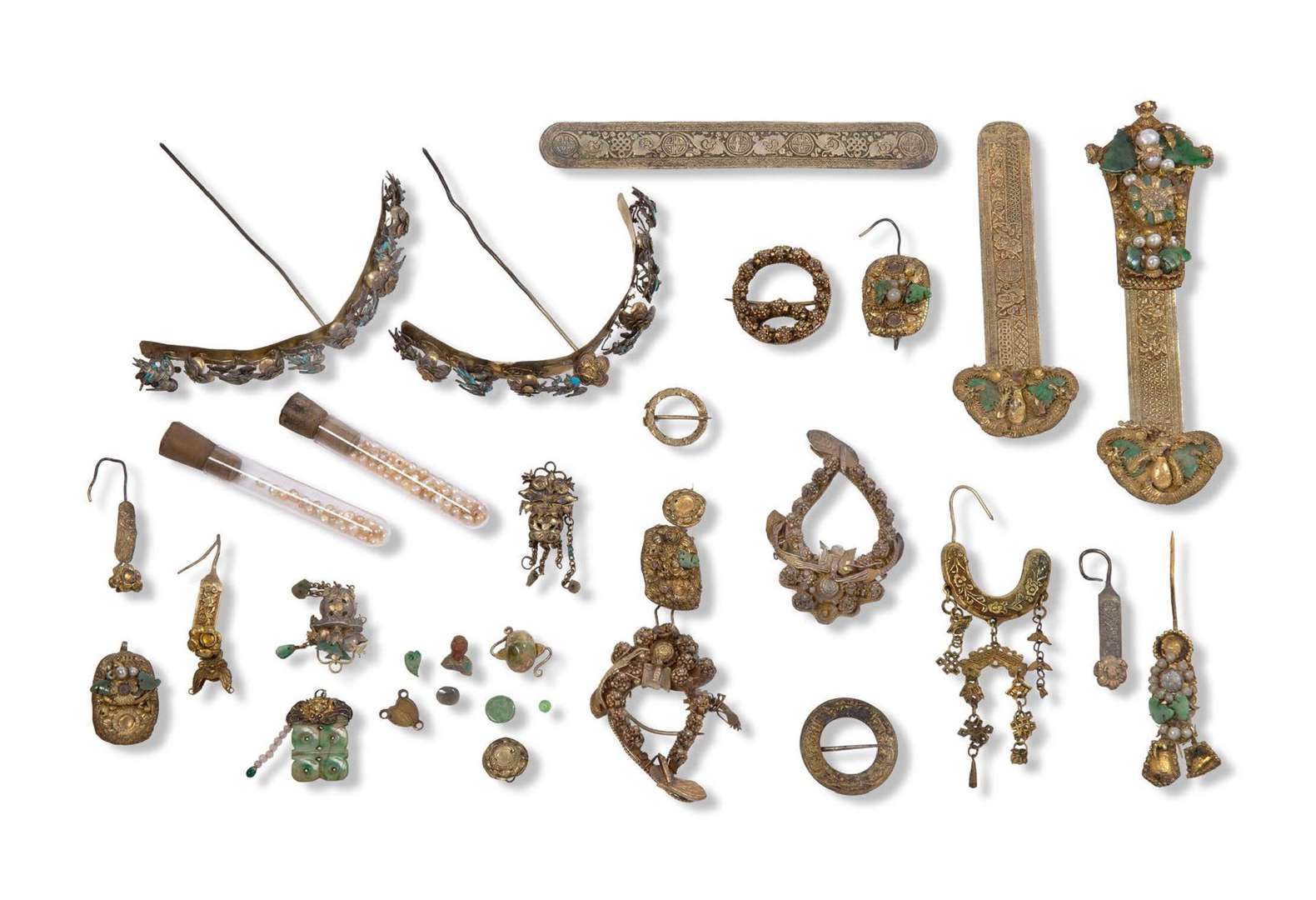 Ensemble d'éléments de coiffure et ornements divers : boucles d'oreilles, petits pendentifs, épingles à cheveux... Chaque pièce travaillée dans diverses techniques d'orfèvrerie (filigrane, granulation, ciselure...) avec des ajouts de pierres dures et perles.