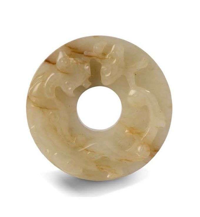 Petit disque Bi en jade céladon sculpté orné d'un chilong tenant un champignon lingzhi dans sa gueule, le corps de l'animal sinueux tournoyant sur le disque. Le revers décoré de motifs archaïsants.
