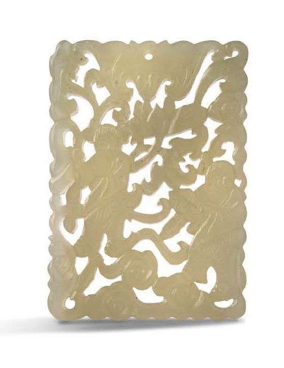 Petite plaque rectangulaire en jade céladon à décor ajouré figurant des enfants parmi un réseau de denses rinceaux floraux.