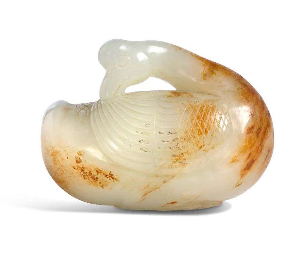 Petit groupe sculpté en jade blanc représentant une oie couchée lissant ses plumes, le cou replié vers l'arrière.