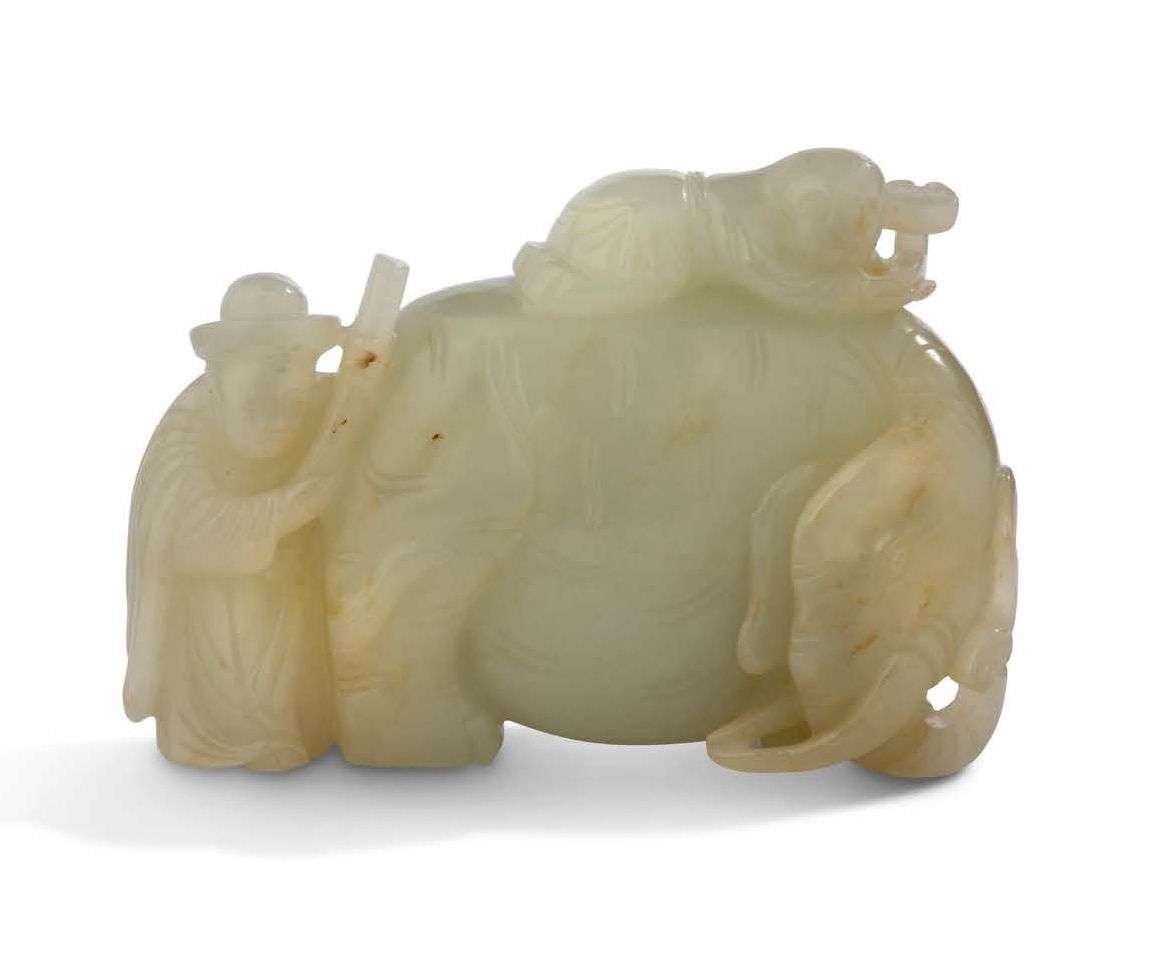 Groupe en jade céladon pâle représentant un éléphant et deux personnages.