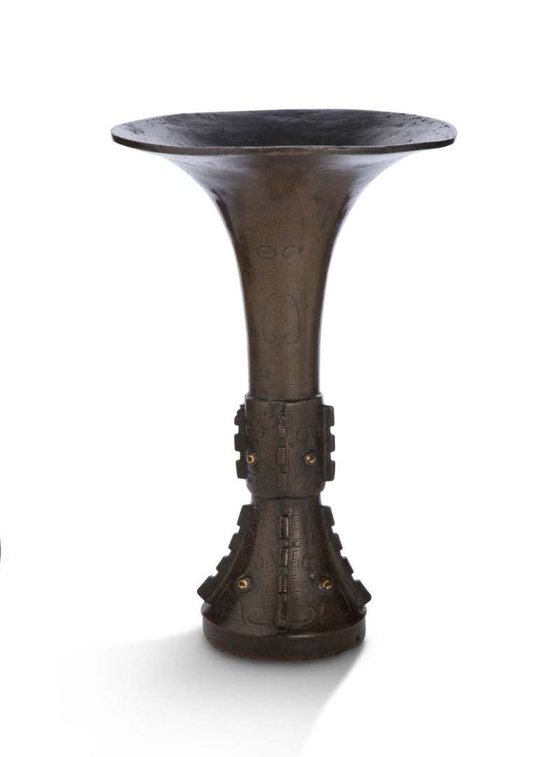 Vase Gu en bronze à patine brune orné d'incrustations d'or et d'argent. Le décor de style archaïsant avec des masques de taotie.