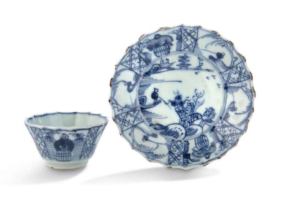 Sorbet et sa soucoupe en porcelaine bleu-blanc à décor de personnages dans un paysage lacustre. Avec son support de présentation en bois naturel.