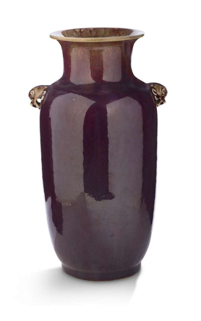 Important vase lanterne en porcelaine monochrome aubergine flambée, l'épaule flanquée de deux prises en forme de têtes de lion bouddhique, le col légèrement évasé.