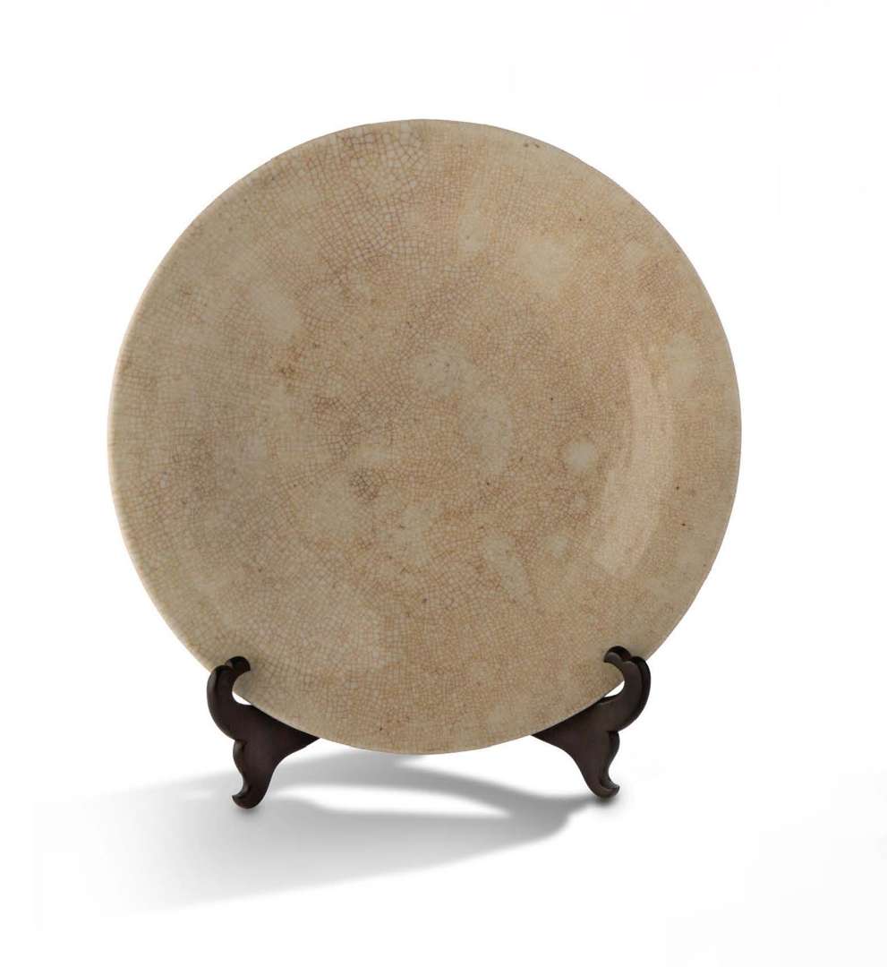 Important plat en porcelaine à couverte de type Ge. La base émaillée avec une marque réservée à quatre caractères gravés en sigillaire et teinté brun. Avec son support de présentation en bois naturel.