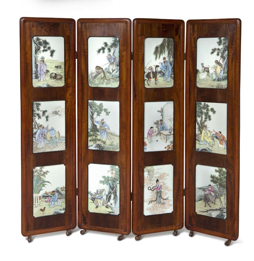 Paravent à quatre feuilles en bois naturel, agrémenté de douze plaques rectangulaires en porcelaine aux émaux de la famille rose, figurant chacun des douze animaux du zodiaque chinois avec des personnages, chaque scène se tenant dans un paysage différent.