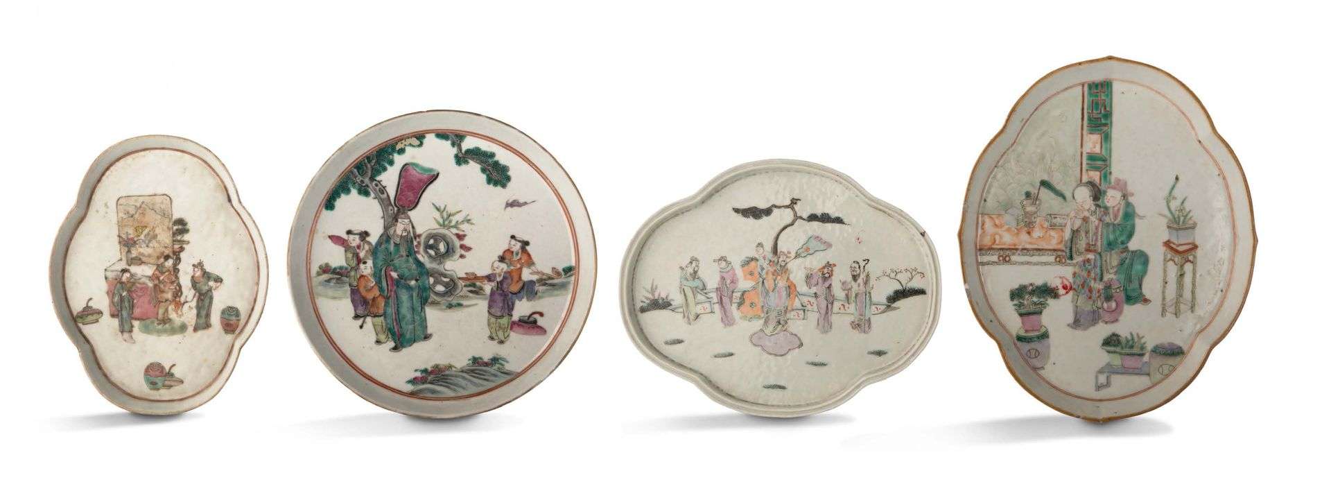 Ensemble de quatre plats en porcelaine aux émaux de la famille rose à décor de personnages dans des jardins et des intérieurs.