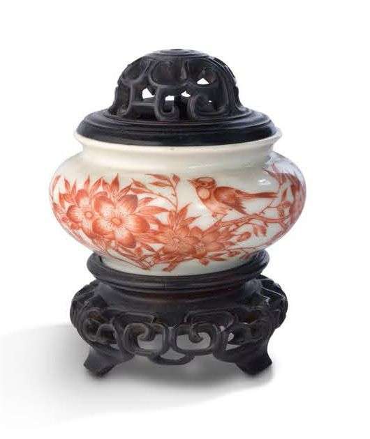 Petit pot à eau en porcelaine à décor en rouge-de-fer d'oiseaux parmi les fleurs.