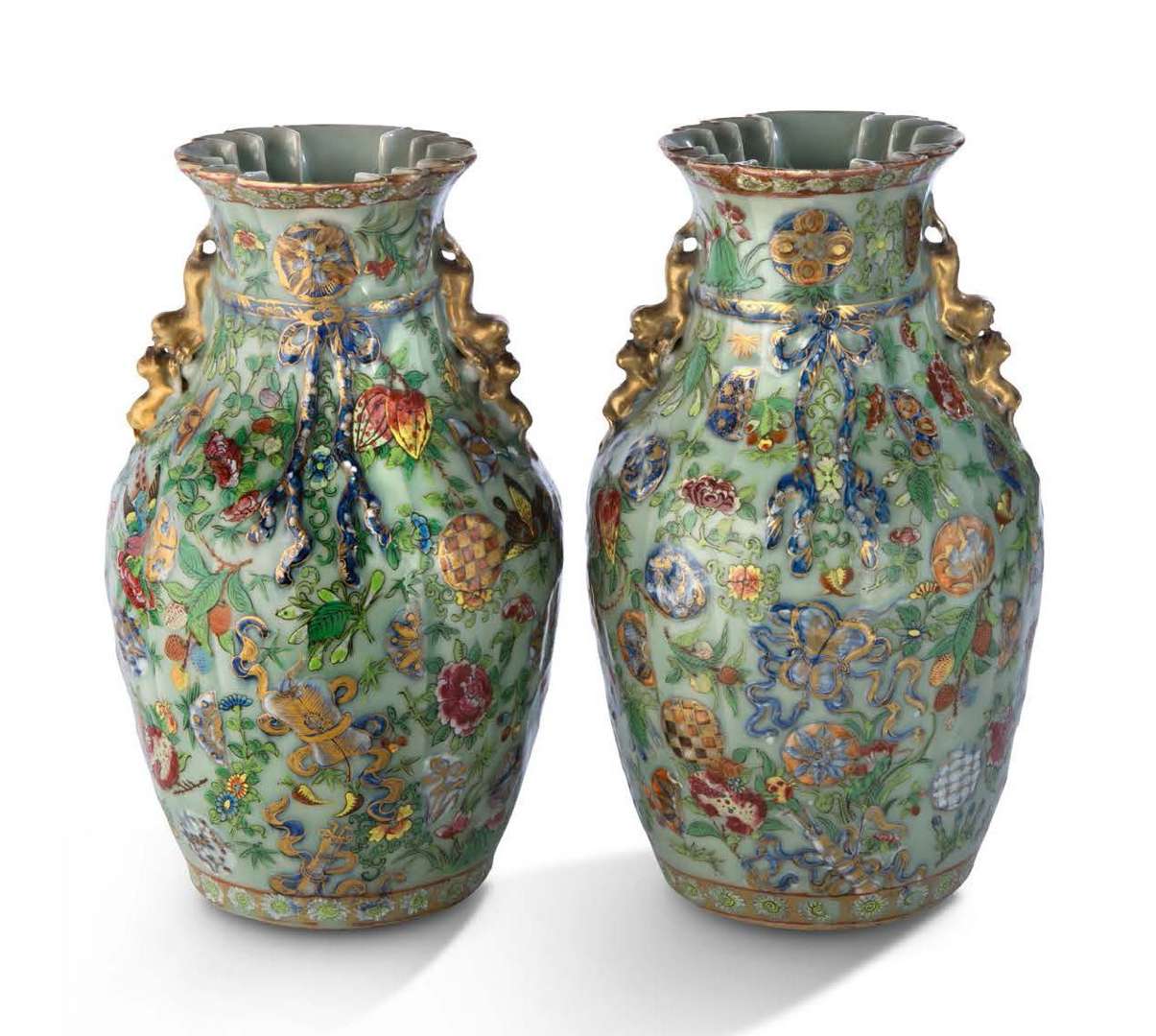 Paire de vases guanyin en porcelaine de Canton à décor aux émaux polychromes et dorure sur fond céladon. Le col froncé à l'imitation du textile, avec un noeud émaillé en trompe-l'oeil. Le corps orné de symboles des immortels taoïstes, parmi les fleurs et les oiseaux. Avec leurs socles en bois naturel.