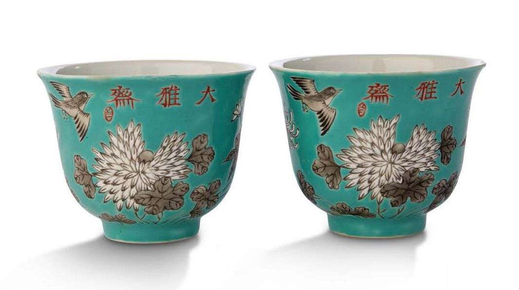 Paire de petites coupes en porcelaine émaillée en grisaille de fleurs de chrysanthèmes et oiseaux sur fond bleu turquoise.