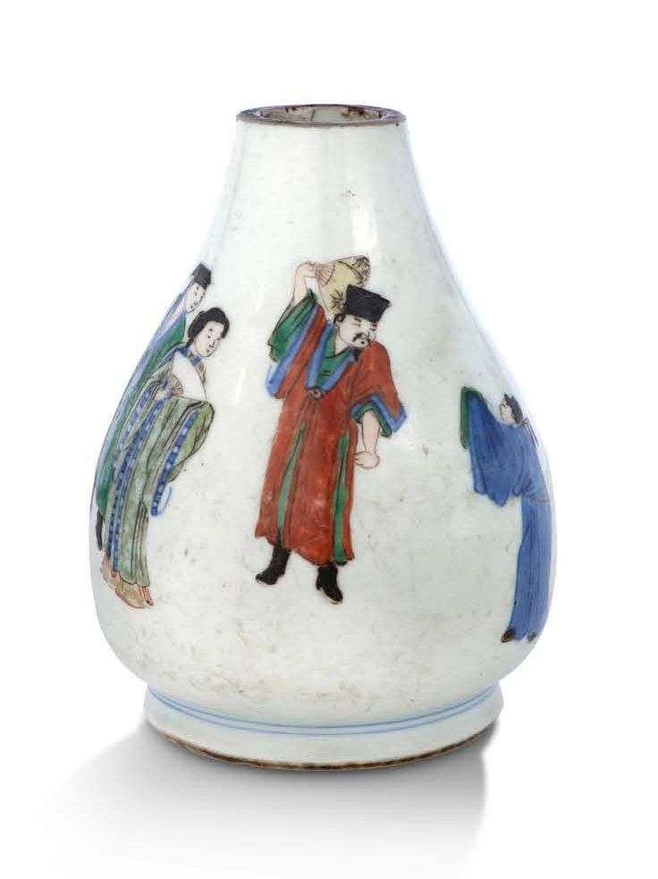Petit vase de forme gourde en porcelaine décorée aux émaux wucai, la panse ornée de quatre personnages et d'un poème en bleu sous couverte, la lèvre teinté brun. La base avec une marque Shi Jin Tang Zhi en kaishu en bleu sous couverte.