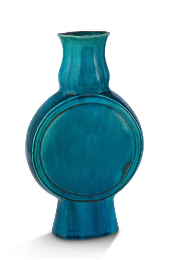 Vase bianhu en porcelaine à couverte monochrome turquoise, la panse ronde aplatie reposant sur un haut pied légèrement conique, le col long formant un renflement à la base puis s'évasant en tulipe.