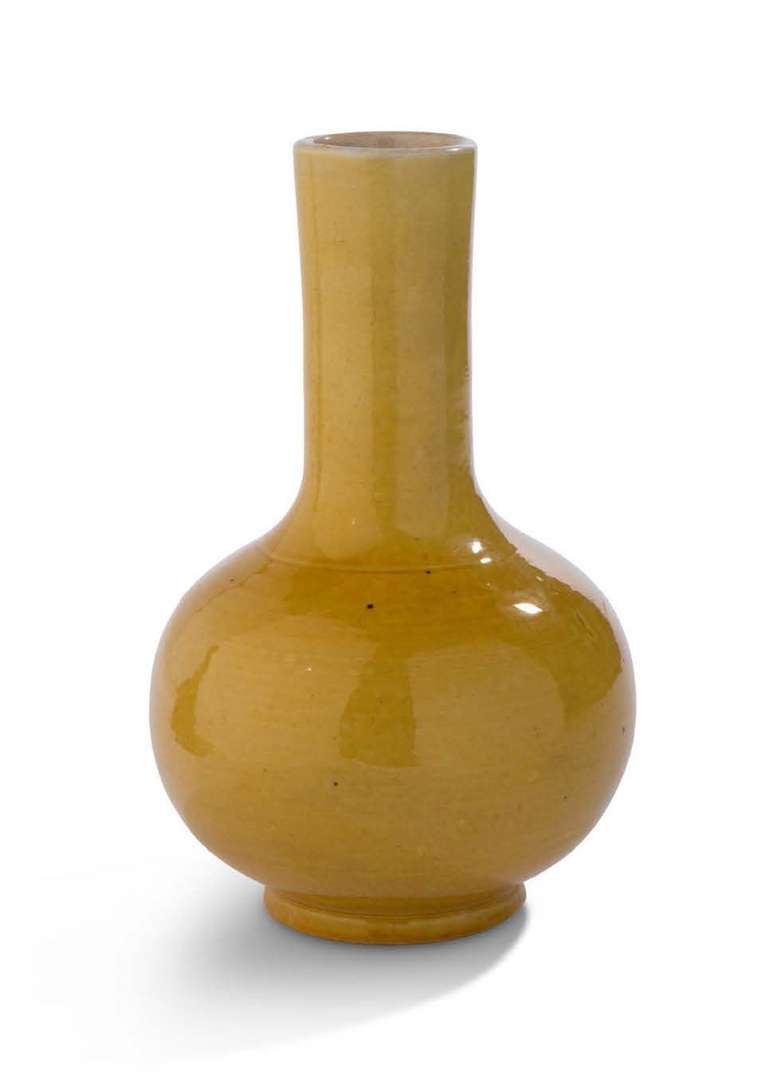 Vase qianqiuping en porcelaine monochrome jaune. La base glaçurée jaune.