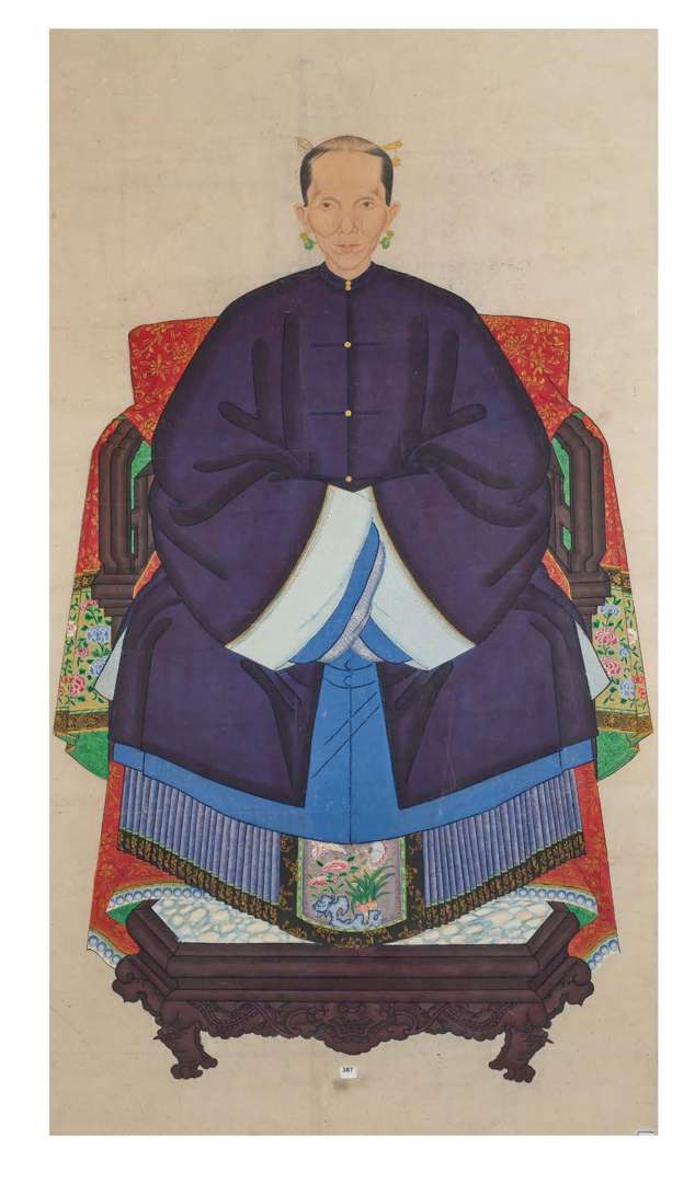Portrait d'ancêtre à l'encre et couleurs sur papier figurant une femme assise sur un fauteuil, les pieds sur un repose-pied ouvragé. Elle est vêtue d'un ruqun composé d'une jupe à plis mamianqun et d'un manteau changfu gua bleu nuit. Le visage, traité de manière naturaliste. Dans un encadrement en plexiglas.