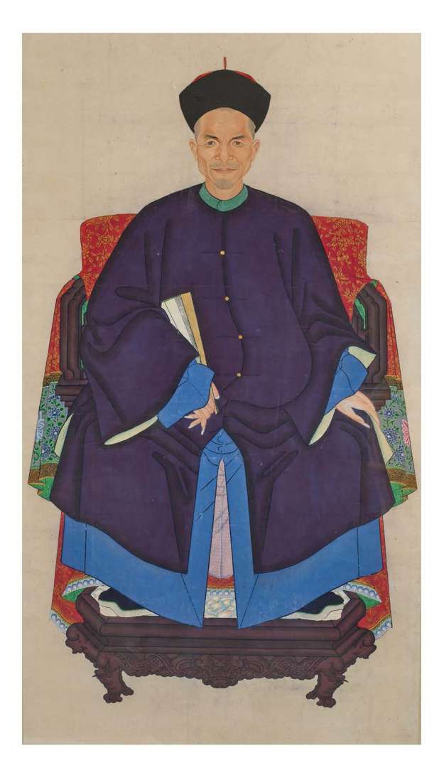 Portrait d'ancêtre à l'encre et couleurs sur papier figurant un homme assis sur un fauteuil, les pieds sur un repose-pied ouvragé. Il est vêtu d'une robe informelle bleue et d'un long manteau changfu gua bleu nuit. Le visage souriant, traité de manière naturaliste, en coiffé d'un chapeau guanmao rouge et noir. Dans un encadrement en plexiglas.