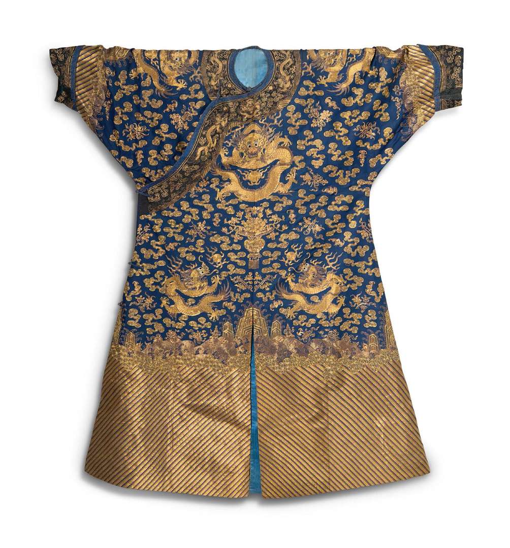 Robe de cour (longpao) en soie bleue nuit brodée aux fils d'or et d'argent de neuf dragons à cinq griffes pourchassant la perle parmi des nuages peuplés de chauve-souris et des emblèmes des Huit Immortels, au-dessus d'une bande de lishui surmontée de flots tumultueux d'où émergent les pics sacrés, des fleurs et les Huit Emblèmes