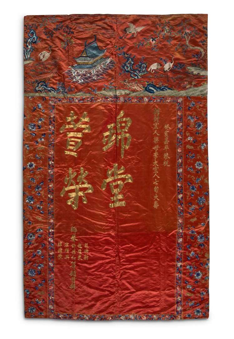 Importante tenture rectangulaire en soie rouge brodée de fils de soie et d'or, la partie centrale ornée d'une sentence en quatre grands caractères et de deux inscriptions dédicatoires. La partie supérieure brodée des grues dans un paysage rocheux de pêchers, bambous, champignons lingzhi surplombant un bâtiment émergeant des flots.