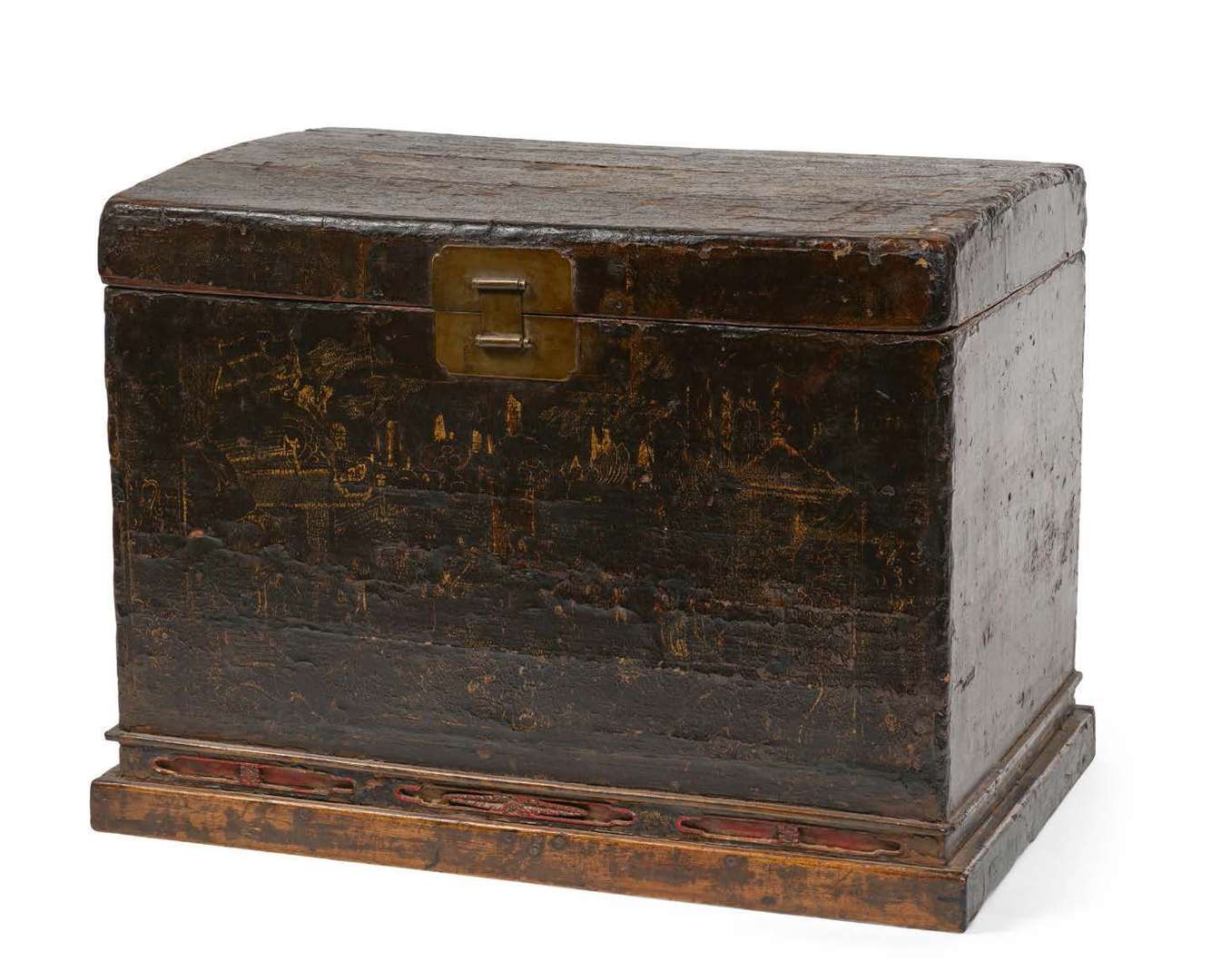 Coffre en bois laqué noir et or à décor de personnages dans un paysage lacustre, les côtés peints d'imposants motifs de fleurs polychromes.
